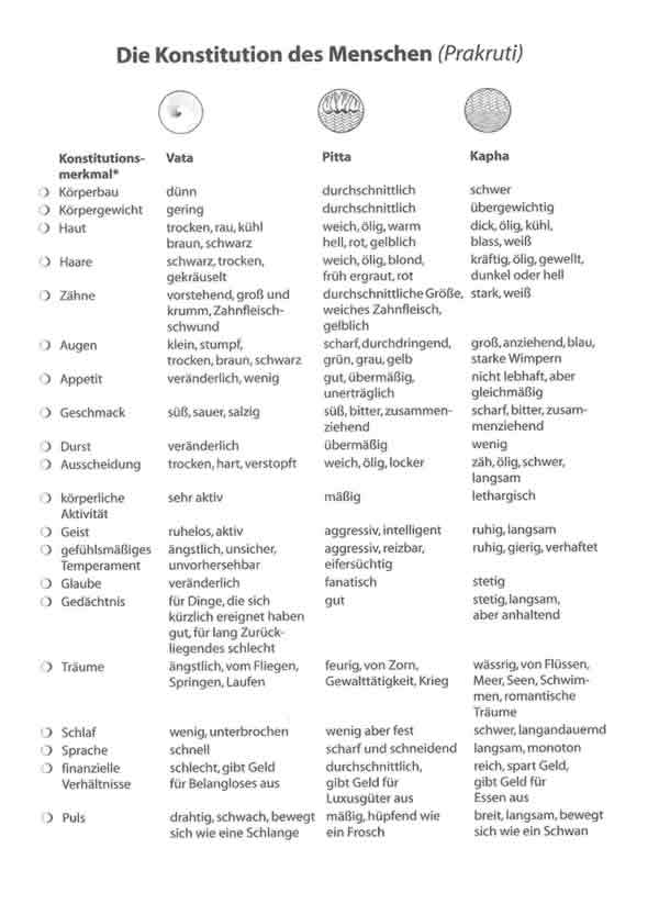 In der ayurvedischen Lehre werden drei verschiedene Arten von Bioenergien, auch Doshas genannt, unterschieden: Vata, Pitta und Kapha. Jeder Mensch hat eine individuelle Mischung aus diesen drei Doshas, die seine körperliche und geistige Konstitution bestimmt.