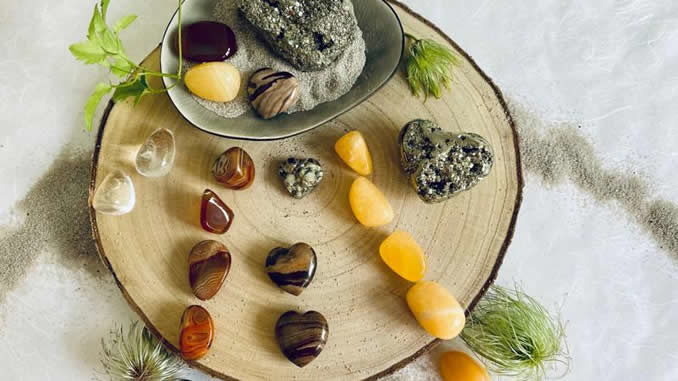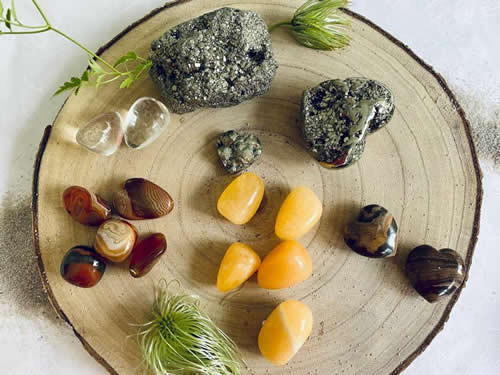 Pyrit, Karneol, Cappuccino-Jaspis und Orangencalcit sind Kristalle, die wichtig sind,