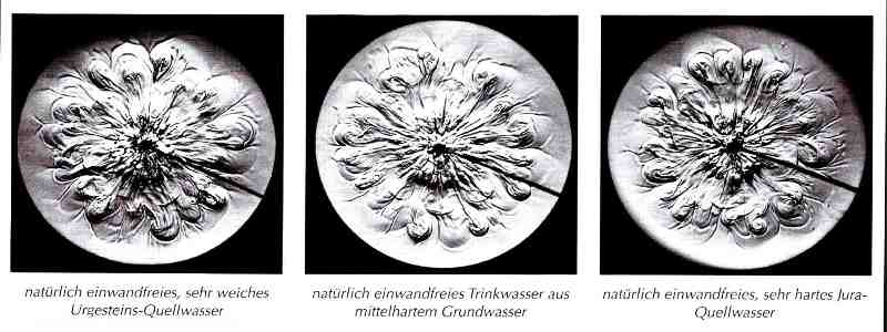 Letztlich betrifft deformiertes Wasser die gleiche Problematik wie bei den Verarbeitungstechniken für Lebensmittel. Die Problematik wird im Ansatz durch die beiden nachfolgenden Bildreihen deutlich. Sie stellen hochwertige dynamische Wässer einem weniger hochwertigen und in seiner Wirbelkraft reduzierten Wasser gegenüber.