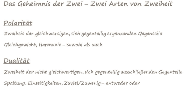 Doch zählen wir weiter von der Eins zur Zwei und kehren zurück zu unserem Thema, der Zweiheit. Wenn wir von Zweiheit sprechen, so ist es nicht überraschend, dass es zwei Arten von Zweiheiten gibt.